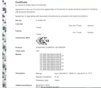 Ürün değişik waat aralığında driver sürücü ise PTC laboratuvarı bu alanda performan testlerini gerçekleştirerek Enec belgenizi almanızı sağlayabilir.